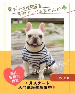 タンクトップやTシャツなどの犬服を作りながら「裁ちばさみの使い方」や「型紙の配置」といった基本知識やミシンの基本技術を習得する事ができ、ホビー初心者さんでも安心して学んで頂けます。