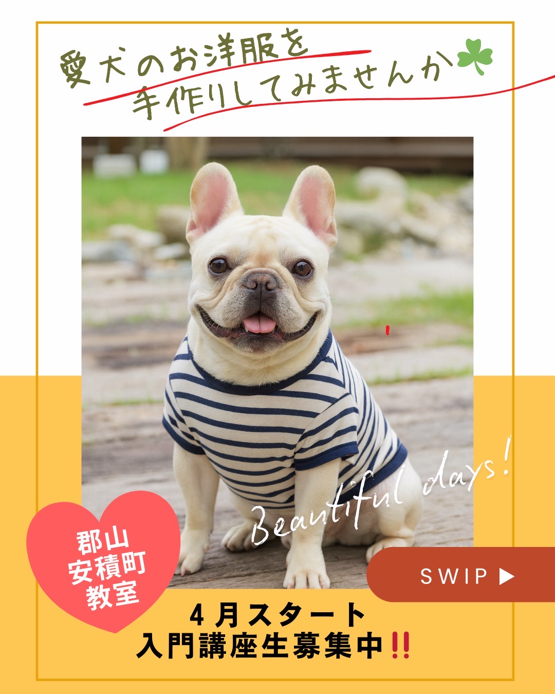 郡山安積町教室にて、2026年4月より犬服づくり入門講座を開講いたします。